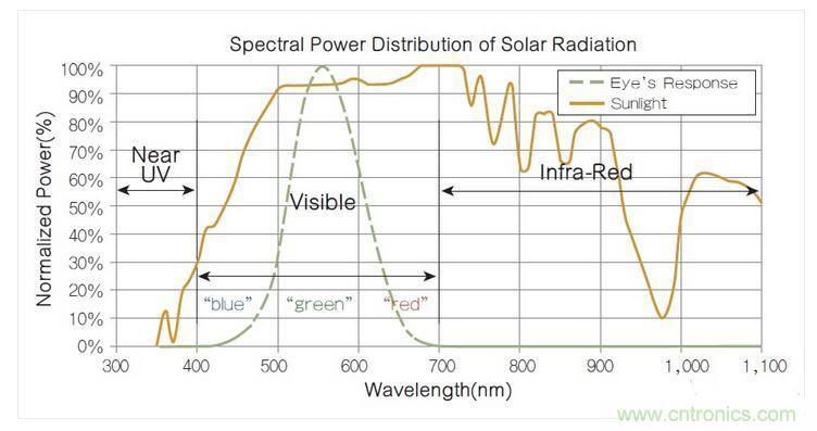 圖1 太陽光的光譜功率分布,其中的強(qiáng)功率紅外線成分對(duì)人眼而言是不可見的。