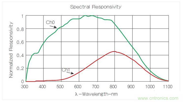 艾邁斯半導(dǎo)體已針對(duì)這個(gè)問題提出一個(gè)更好的解決方案:雙二極管(dual-diode)模塊。其中一個(gè)光電二極管(如圖2中所示的Channel 0)用來感測(cè)全光譜,另一個(gè)(圖中的Channel 1)則主要用來感測(cè)光譜中的紅外線部分。從全光譜傳感器的輸出中減掉紅外線光電二極管的輸出,則可得到可見光的測(cè)量結(jié)果。