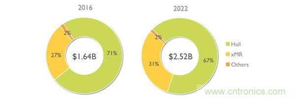 xMR磁阻傳感器市場的增長或與霍爾技術相結合,或搶占了后者的市場份額。根據Yole發布的《磁傳感器市場與技術-2017版》報告, xMR技術的主要優勢體現在更高的靈敏度,因此它們主要用于電子羅盤和位置測量,尤其是精確的角度測量應用。