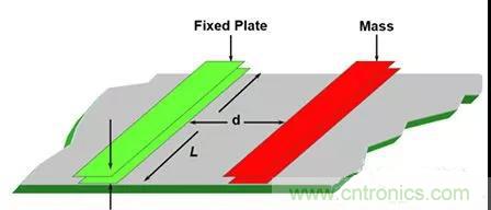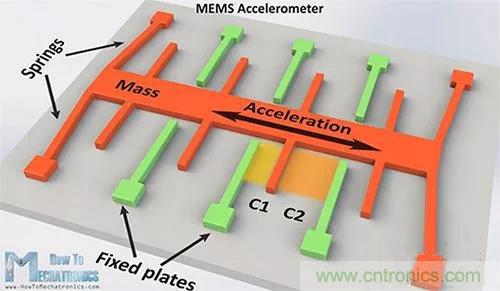 通用 MEMS 感應技術是使用片載可變電容器。在運動中,綠色的固定板保持靜止,而橙色的重物沿加速度軸彎曲。通過這種運動,電容值 C1 和 C2 會隨著固定板與重物之間距離的變化而變化。