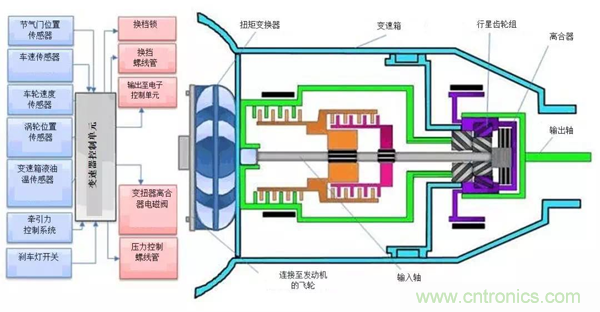 自動(dòng)變速器汲取汽車發(fā)動(dòng)機(jī)產(chǎn)生的功率,然后通過(guò)符合各種駕駛需求的不同的齒輪傳動(dòng)比傳導(dǎo)這些功率。齒輪傳動(dòng)比之所以不同,是為了確保發(fā)動(dòng)機(jī)轉(zhuǎn)速(RPM)和供應(yīng)給車輪的扭矩與當(dāng)前車速和加速度匹配。來(lái)自發(fā)動(dòng)機(jī)飛輪的動(dòng)力通過(guò)扭矩變換器傳輸給變速器(見圖1)。