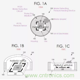 具有檢測(cè)水分功能的壓力傳感器專(zhuān)利申請(qǐng)圖片,圖1A至圖1C展示了不同視角的壓力傳感器,其可利用電極檢測(cè)保護(hù)介質(zhì)上的水分(150)