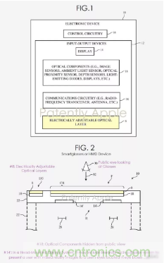 蘋(píng)果公司希望通過(guò)此專(zhuān)利推進(jìn)其在可調(diào)節(jié)光學(xué)層上的技術(shù)發(fā)展。此發(fā)明支持使用者對(duì)智能眼鏡的光學(xué)層進(jìn)行模式調(diào)節(jié),例如按照個(gè)人喜好調(diào)整光學(xué)層的明暗。下圖1是具有光學(xué)組件和電可調(diào)光學(xué)層的電子設(shè)備示意圖;下圖2是頭戴式設(shè)備采用電可調(diào)光學(xué)層(#8)的示意圖。