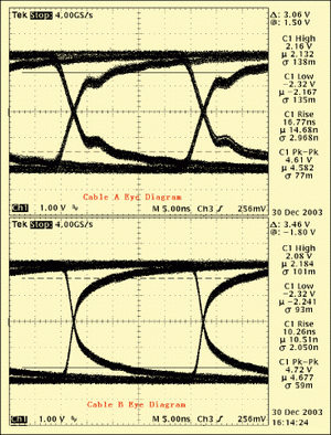 圖4是實(shí)際應(yīng)用的眼圖情況,很明顯電纜B的眼圖要比電纜A的眼圖要好,和前面的仿真結(jié)果比較吻合,不過電纜A的實(shí)際反射比較大一點(diǎn),這和仿真使用驅(qū)動器件的模型有關(guān)。