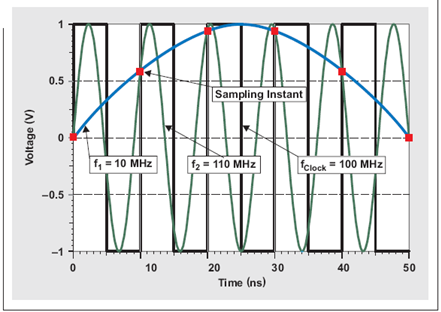 圖 1 100MSPS 采樣的兩個(gè)輸入信號(hào)顯示了混疊帶來(lái)的相同采樣點(diǎn)
