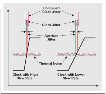 我們?cè)诋a(chǎn)品說(shuō)明書中可以找到 ADC 的孔徑口抖動(dòng) (aperture jitter)。這一值一般與時(shí)鐘振幅或轉(zhuǎn)換速率一起指定,記住這一點(diǎn)很重要。低時(shí)鐘振幅帶來(lái)低轉(zhuǎn)換速率,從而增加窗口抖動(dòng)。