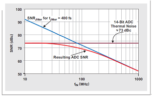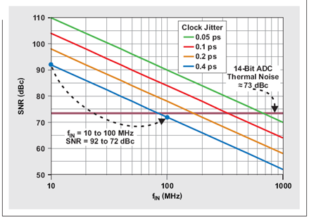 圖 5 產(chǎn)生的 ADC SNR 受熱噪聲和時(shí)鐘抖動(dòng)的限制