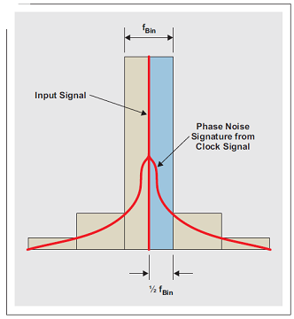 在采樣過(guò)程中,輸入信號(hào)與采樣時(shí)鐘信號(hào)混頻在一起,包括其相位噪聲。當(dāng)進(jìn)行輸入信號(hào) FFT 分析時(shí),主 FFT 容器 (bin) 集中于輸入信號(hào)。采樣信號(hào)周圍的相位噪聲(來(lái)自時(shí)鐘或輸入信號(hào))決定了鄰近主容器的一些容器的振幅,如圖 7 所示。因此,小于 1/2 容器尺寸的偏頻的所有相位噪聲都集中于輸入信號(hào)容器中,且未增加噪聲。因此,相位噪聲整合帶寬下限應(yīng)設(shè)定為 1/2 FFT 容器尺寸。 FFT 容器尺寸計(jì)算方法如下: