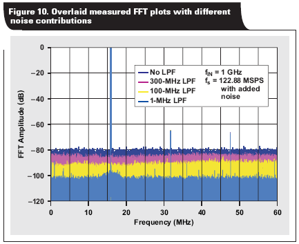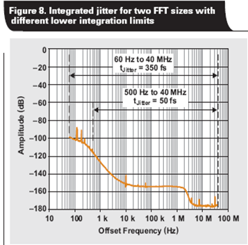 該實(shí)驗(yàn)表明,時(shí)鐘相位噪聲必需非常低或者帶寬有限,較為理想的情況是通過(guò)一個(gè)很窄的帶通濾波器。否則,由系統(tǒng)時(shí)鐘帶寬設(shè)定的整合上限會(huì)極大降低 ADC 的 SNR。