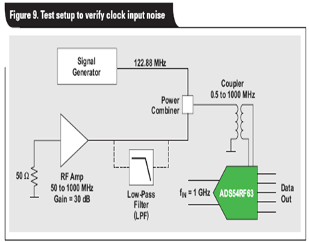 若想要驗(yàn)證時(shí)鐘相位噪聲是否需要整合至?xí)r鐘輸入帶寬,則需建立另一個(gè)實(shí)驗(yàn)。ADS54RF63 再次工作在 122.88 MSPS,其輸入信號(hào)為 1GHz,以確保 SNR 抖動(dòng)得到控制。我們利用一個(gè) RF 放大器,生成 50MHz 到 1GHz 的寬帶白噪聲,并將其添加至采樣時(shí)鐘,如圖 9 所示。之后,我們使用幾個(gè)不同低通濾波器 (LPF) 來(lái)限制添加至?xí)r鐘信號(hào)的噪聲量。